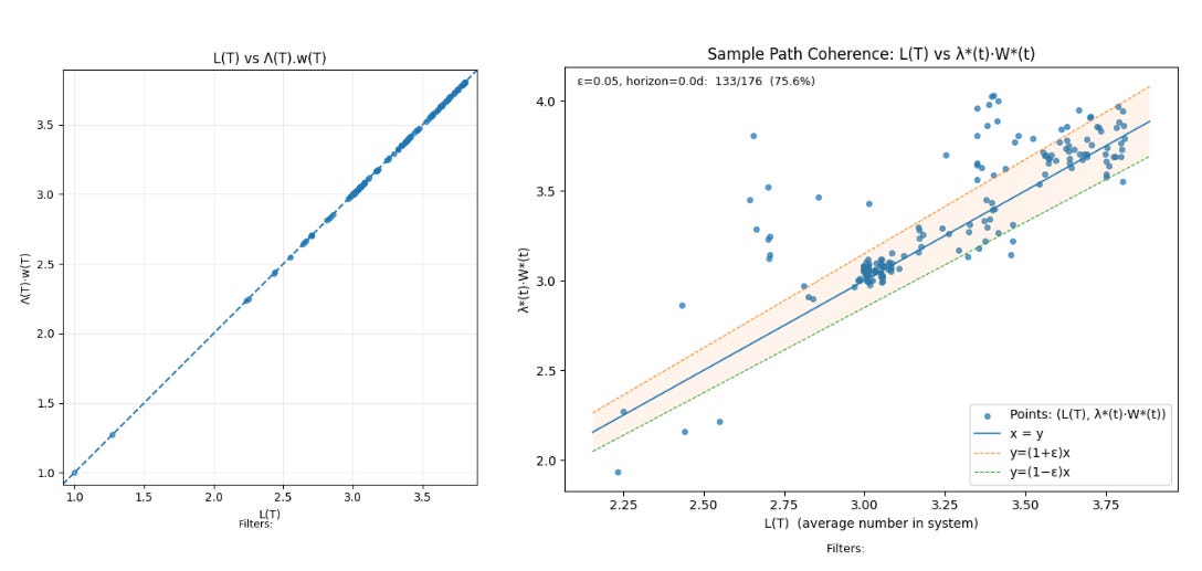 The plot on the left hand side plots t L(T) vs Λ(T).w(T) and since these are always equal per the finite version of Little’s Law, all points will lie on the x=y line. The plot on the right show L(T) vs λ*(T).W*(T) and these will points will lie on the x=y only when the process is coherent.