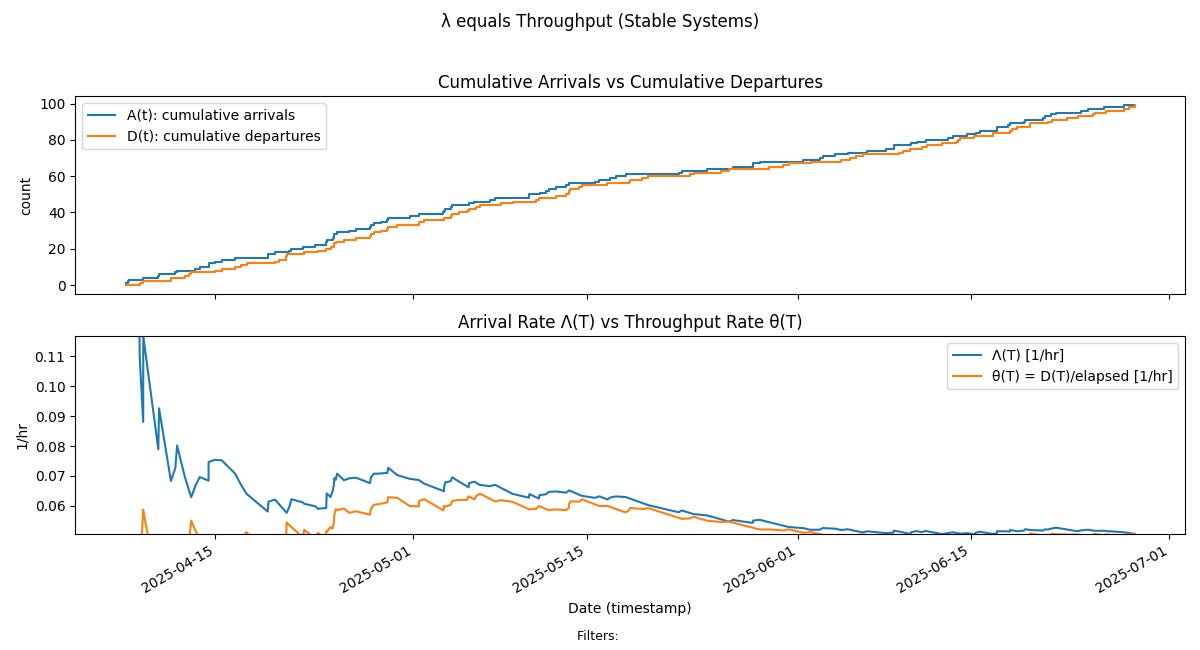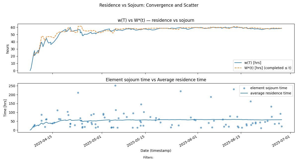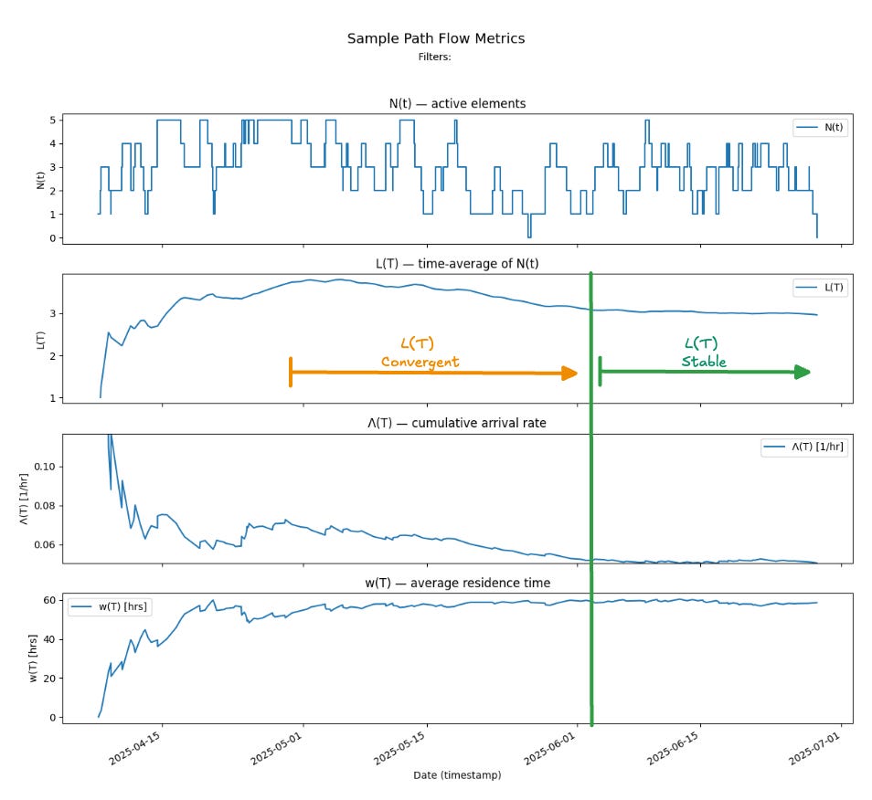 Technically, finite bounds on Λ(T) and w(T) alone don’t guarantee convergence. Additional rate-stability conditions on N(t) and the cumulative age of work items are also required. In practice, though, if a team consistently adheres to WIP limits and SLAs, these conditions are automatically satisfied — and they can be verified directly from operational data. We will discuss this point in more detail in the next post where it will be germane to arguing that the process is stable.