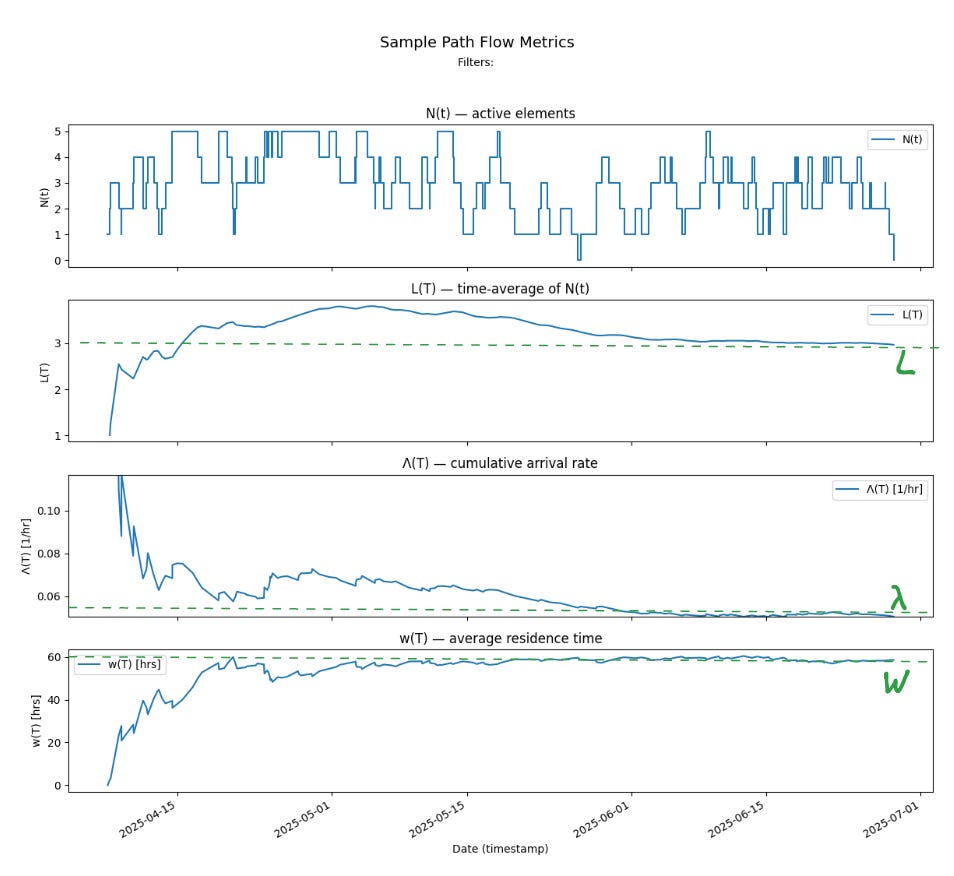 These long-run metrics have several advantages over the industry-standard flow metrics used today. They are stable, interpretable, and slow to fluctuate from day to day. When they do change, it usually reflects a genuine shift in the underlying process dynamics. That makes them far more useful for decision-making and for reasoning about system behavior, and more importantly for communicating with external stakeholders when things change7.