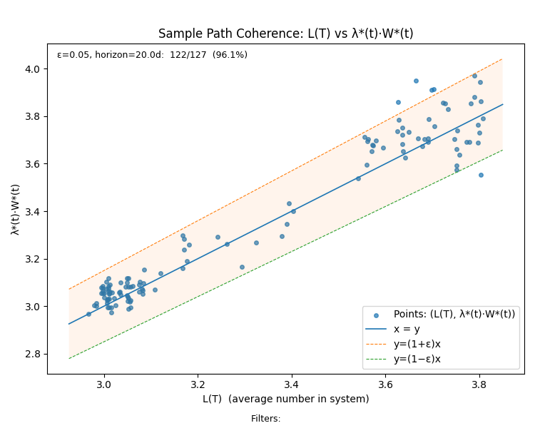 For our sample path, removing the first 20 days of observations, we get the following sample path coherence chart - which indicates that the sample path flow metrics remain within 5% of externally facing business metrics for 96.1% of the sample path excluding the initial mixing period.