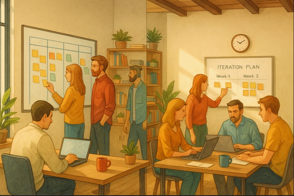The second is a classic XP team. They work in close collaboration with an internal customer, delivering working software increment every single week. Their cadence alternates: one week they ship a meaningful enhancement, the next week they iterate quickly—making smaller improvements, responding to feedback, and fixing any bugs. They respect their iteration timebox strictly, cutting scope if needed to keep commitments within the box.