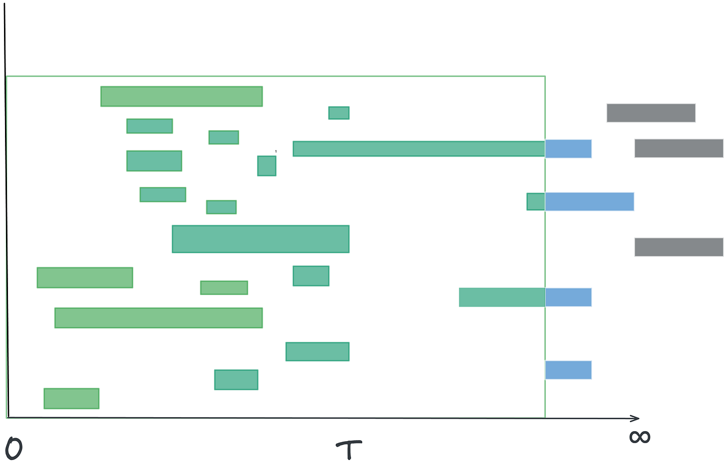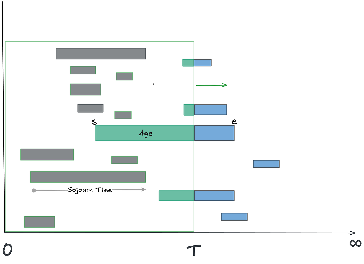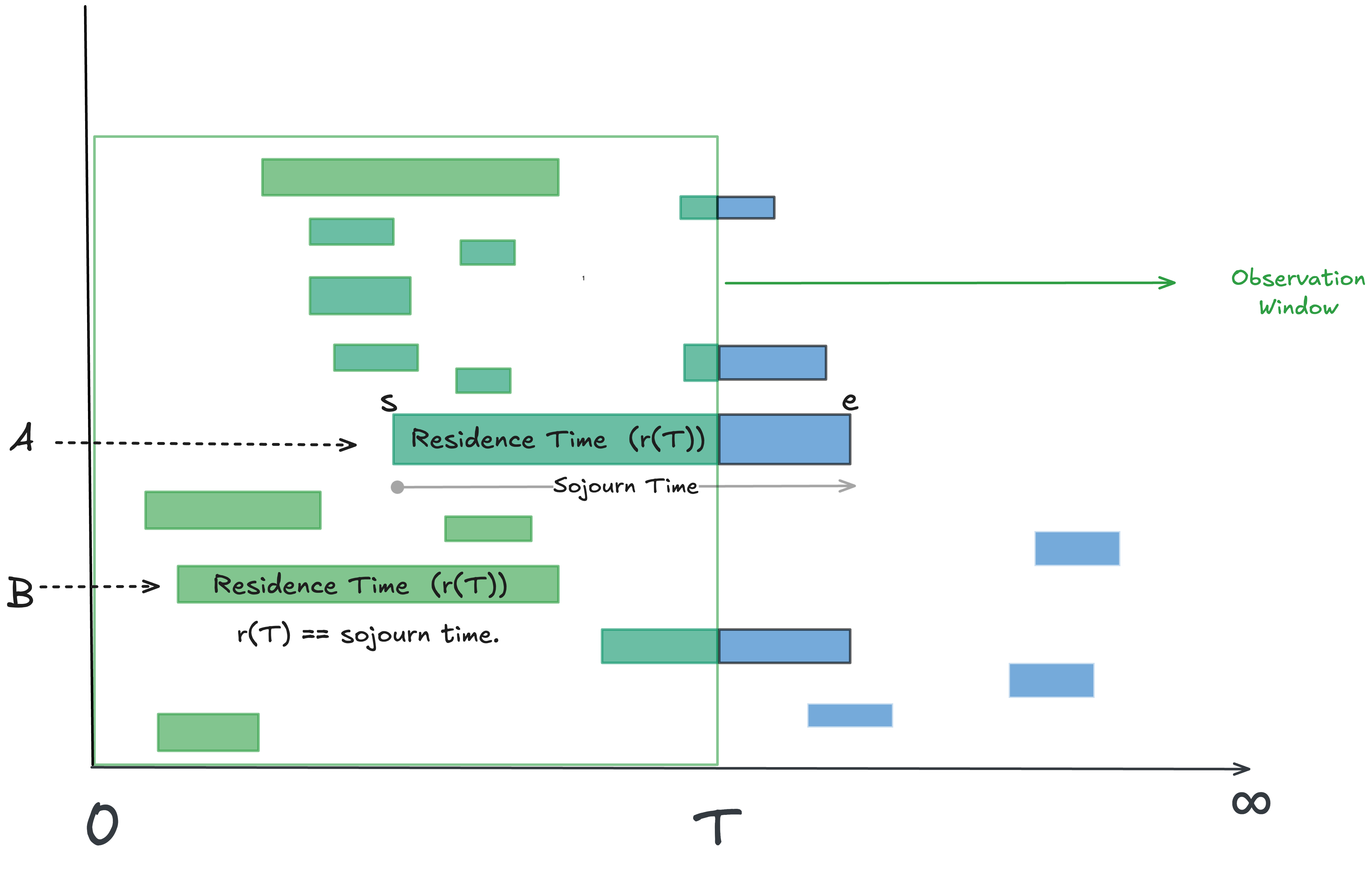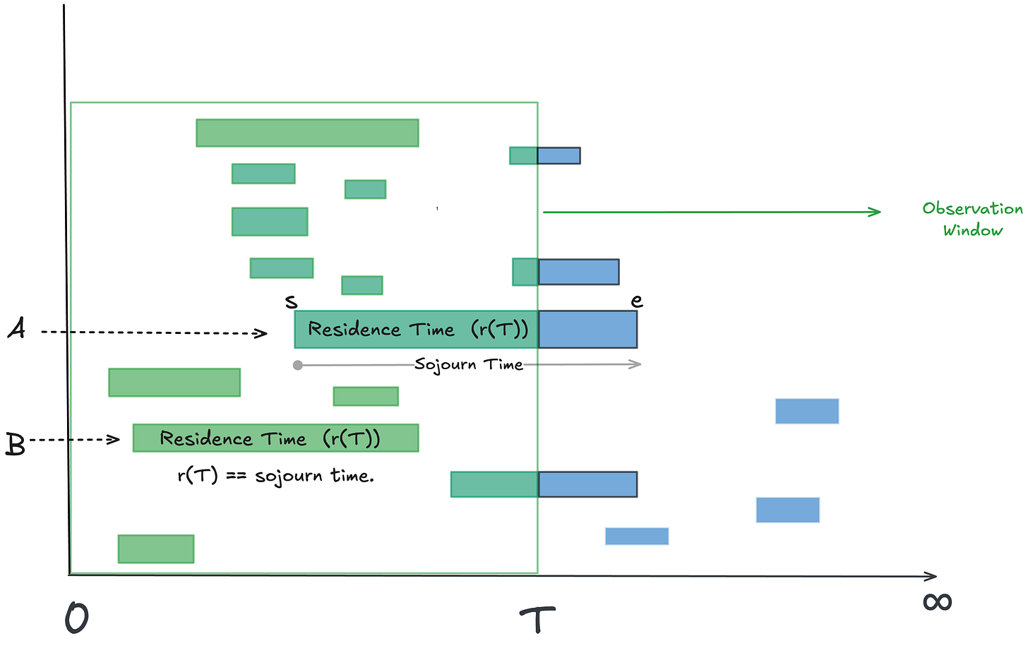 In convergent processes, if you observe long enough, the average residence time and the average sojourn time converge. Intuitively, the “blue bits” you haven’t yet seen - the remaining tails of in-flight items - become negligible compared to the total observed sojourn times across all instances in a long enough observation window.