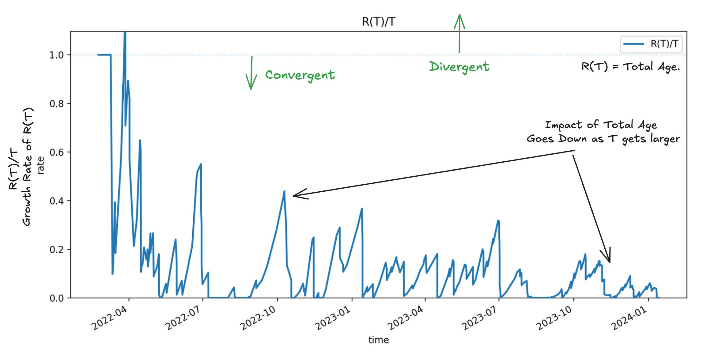 Convergent: Age contribution to the total shrinks over longer windows; the two averages move closer together. If they come together and stay there, we call the process stable.