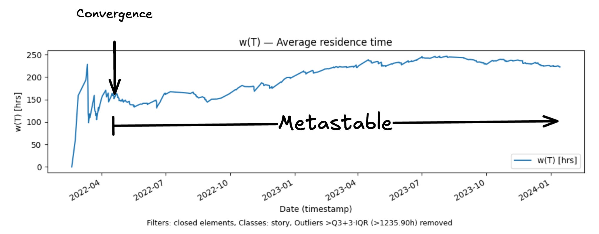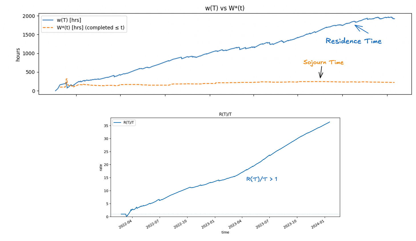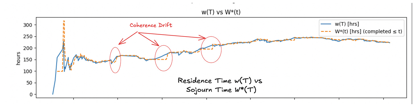 Watch whether unfinished age grows sub-linearly. If it does, average residence time ≈ average sojourn time, and you have a defensible, real-time answer to “how long does it take?” whether that is closing a deal, shipping a feature, or negotiating a contract.