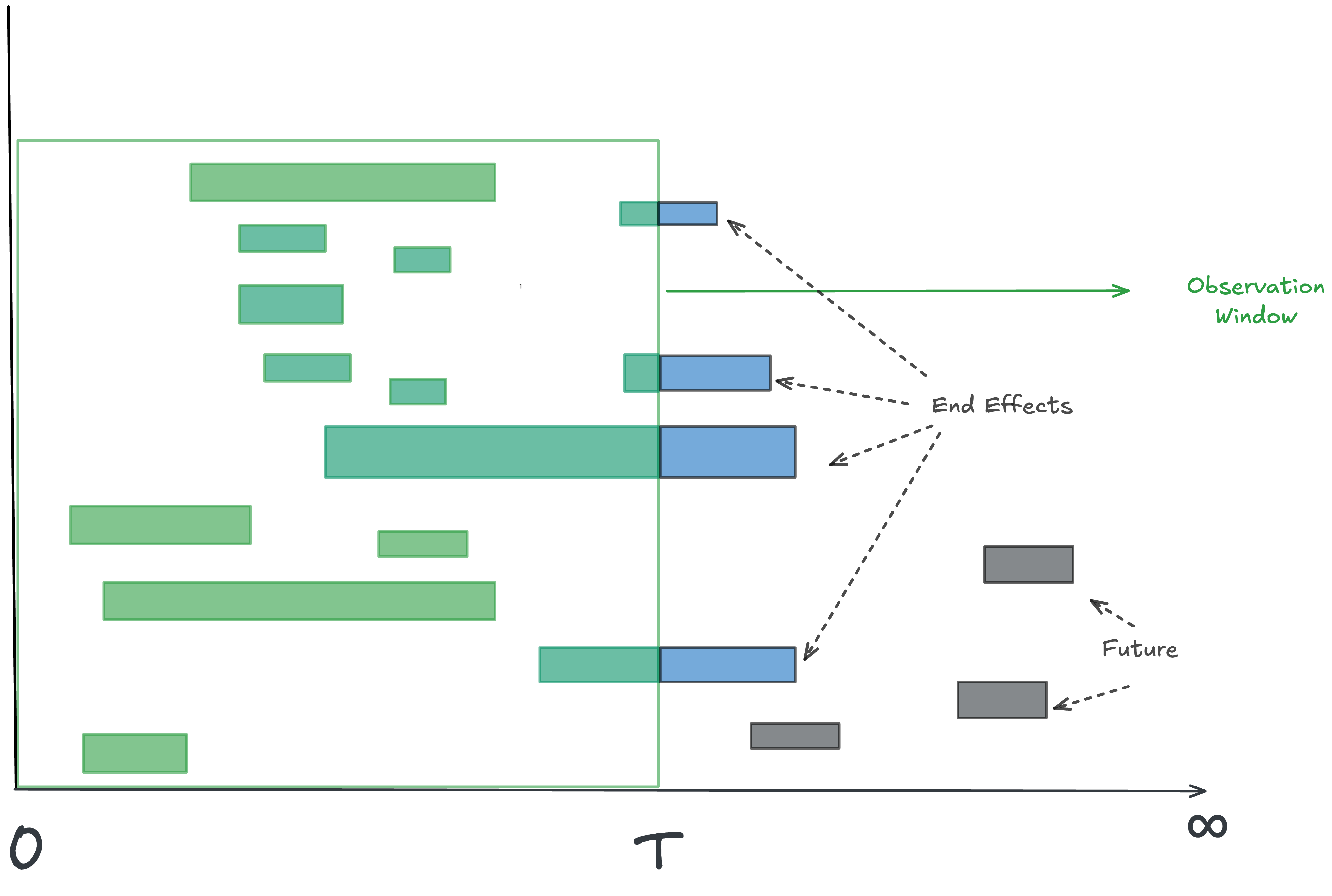 Our lens for uncertainty is deterministic: we observe a single sample path that unfolds in time. We can observe up to the present, but we cannot see into the future. In this interpretation, end effects represent the uncertainty in what can be known, at a given time, about when ongoing process instances will complete.