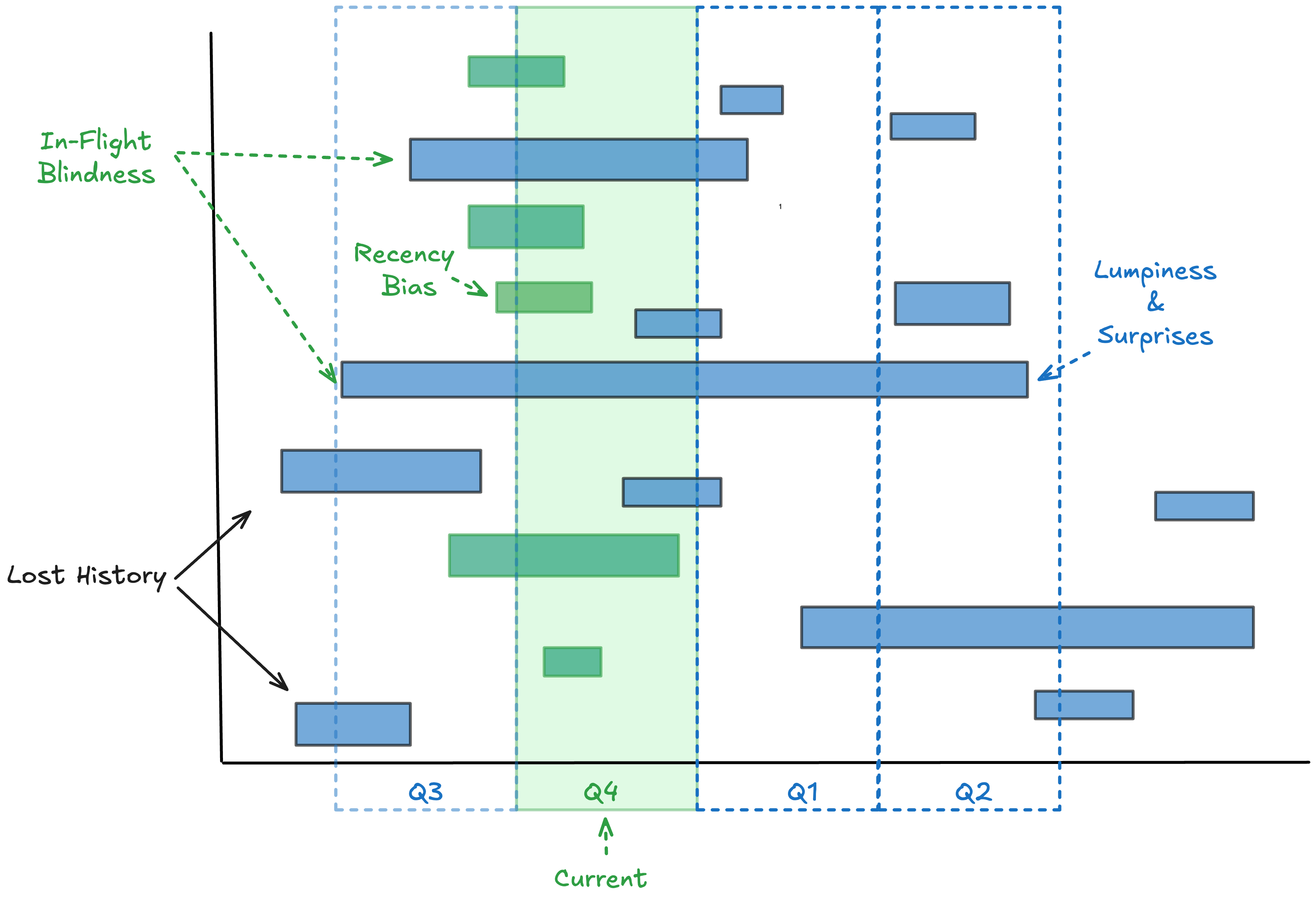 Its a very different question and as shown in Fig 1, it produces a noisy, volatile number that suffers from memory loss, recency bias, lagging effects from deals that take a long time to close, and most importantly, ignores the biggest risk items at the time of measurement: the time spent on pending deals that aren’t being counted in the average in the quarter being measured. We are all familiar with the end-of-quarter gymnastics to make the sales “numbers” that results from this strategy1.