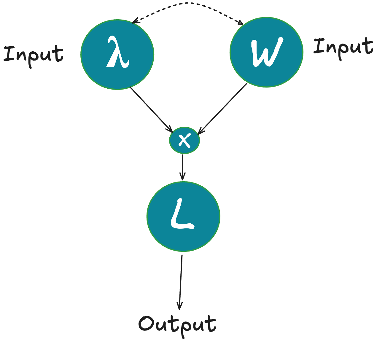 The causal mechanism: 𝐋 changes when and only when 𝛌 or 𝐖 change.